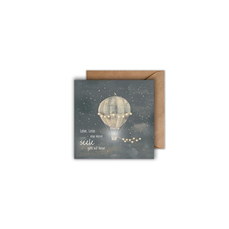 - SENSITIVE DESIGN The card features a softly lit hot air balloon floating in a starry night sky, accompanied by the text "Quiet, quiet, a little soul goes on a journey!" A comforting and empathetic way to express sympathy.