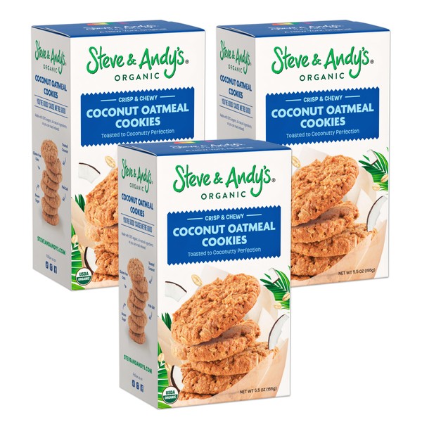 Steve & Andy’s Crunchy, Chewy Coconut Oatmeal Cookies -Organic, Gluten Free, Non-Gmo, Vegan, Dairy Free, Nut Free, Egg Free, Wheat Free, Soy Free, Plant-Base– 16.5 Oz, 3 Boxes (30 Cookies)
