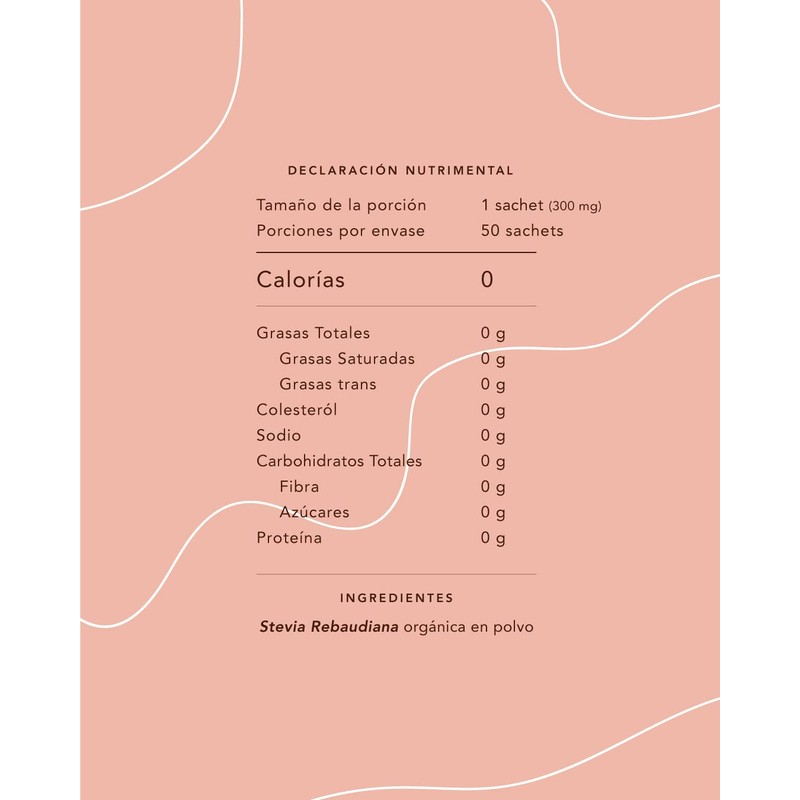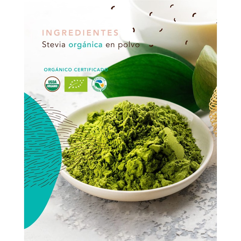 - Ingredientes: hoja de Stevia orgánica en polvo