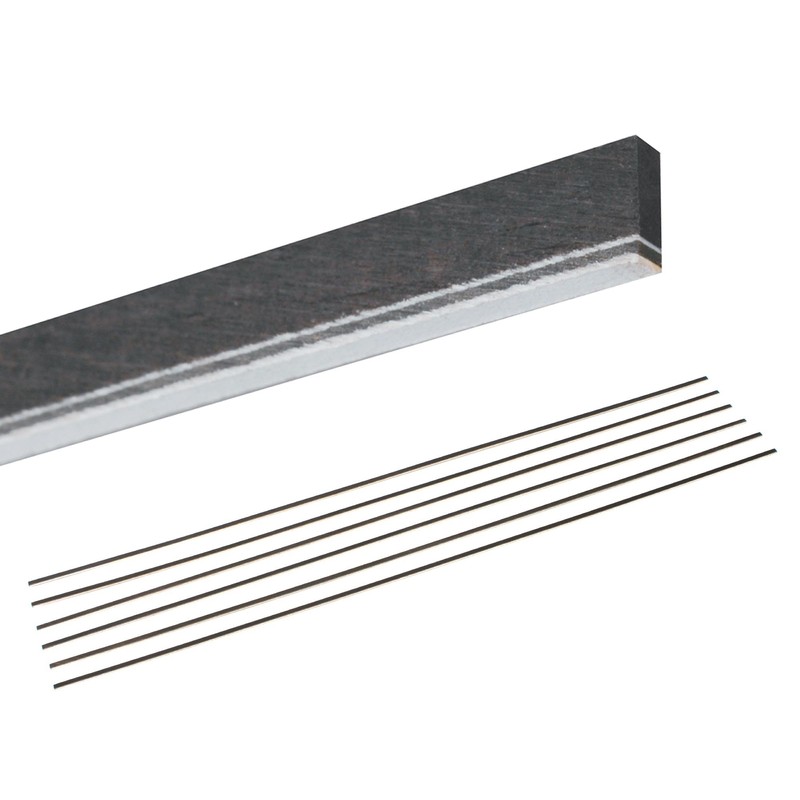 Each unbent strip is approximately 0.080" thick, 0.250" tall and 33-1/2" long (2.03mm x 6.35mm x 850.90mm). The triple lamination is .010"/.020"/.010" white and black fiber.