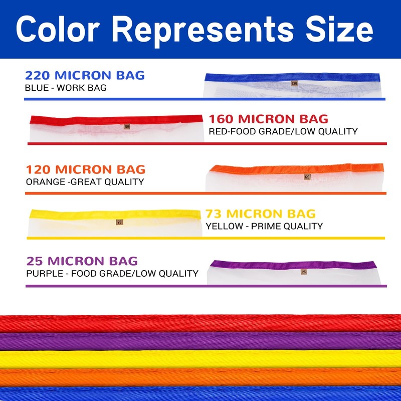 - High-quality materials: this hash maker is made of durable food grade monofilament net and is reinforced with extra robust double seams. Color coded micron sizes (25-220 microns) make it ideal for precise filtration like Iceolator and Bubble Hash