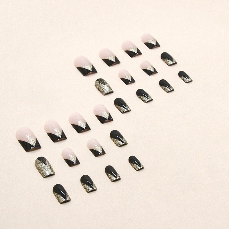 Stick on Nails - 24pcs Short Square False Nails - Black Press on Nails with Gold Sequins - Fake nails with Glue in 12 Sizes - Glossy Removable Acrylic Glue onNails for Women Girls
