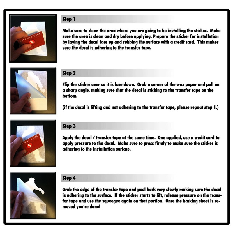 - Easy To Apply - - These vinyl stickers are self adhesive and easy to install. Just peel the wax paper from the backing sheet, lay the sticker flat on the surface you would like to install it on. Use a credit card or squeegee to apply pressure then remove the backing sheet slowly.