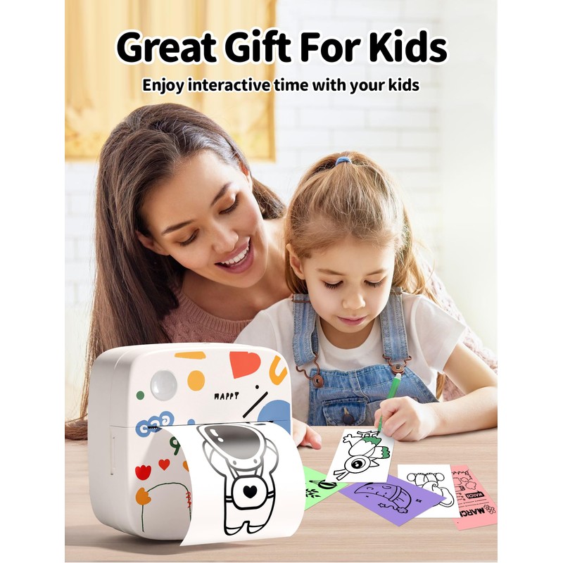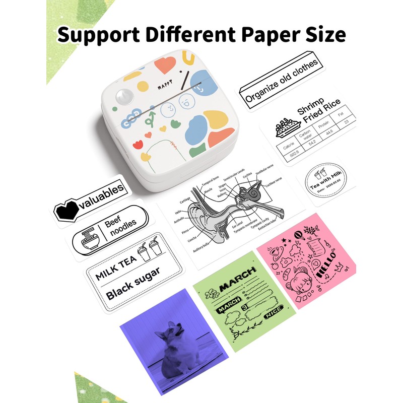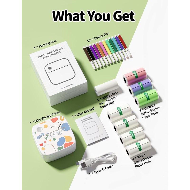 - Mini Thermal Printer with 8 Rolls Paper: Customizable sticker maker comes with tons of stickable paper rolls. 1 * thermal receipt paper, 4 * sticker paper, 3 * colored sticker paper, 12 * colored pens.It can be used to print labels, study notes, photos, lists, memos, and improve organizational efficiency