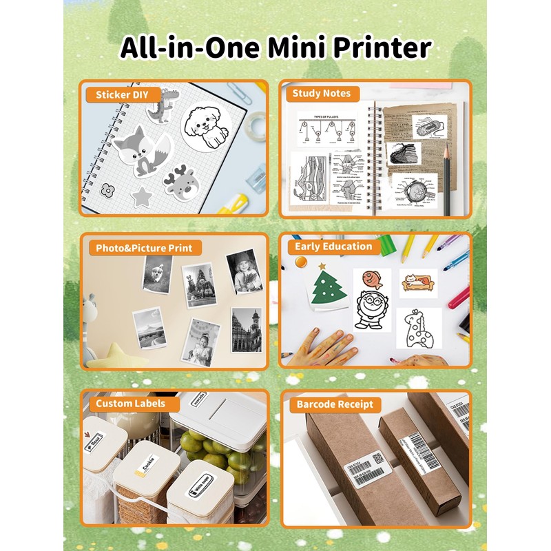 - Wide Using Mini Sticker Printer: This sticker printer machine is versatile and allows you to print black and white photos/pictures, perfect for printing stickers, memos, shopping lists, study notes,labels, lists, QR codes and records. Suitable for various scenarios such as home,office, children, it can meet all the needs of your daily life and work
