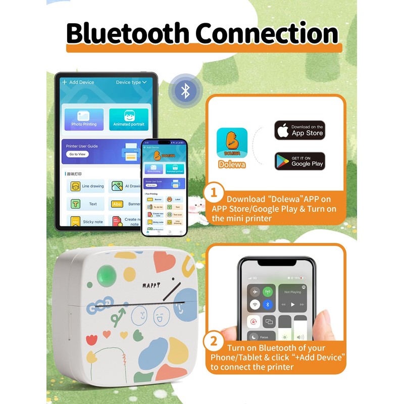 - User Friendly Mini Pocket Printer: The bluetooth sticker maker is compatible with IOS & Android phones via Bluetooth connection. Follow the steps, 01:Long press the printer for 3 seconds to turn on the sticker printer, 02: Search "Dolewa" APP on "APP Store" or "Google Play" and download it, 03: Turn on the Bluetooth of you phone/tablet and connect it with the "Dolewa" APP, 04: Select your desired template and start printing