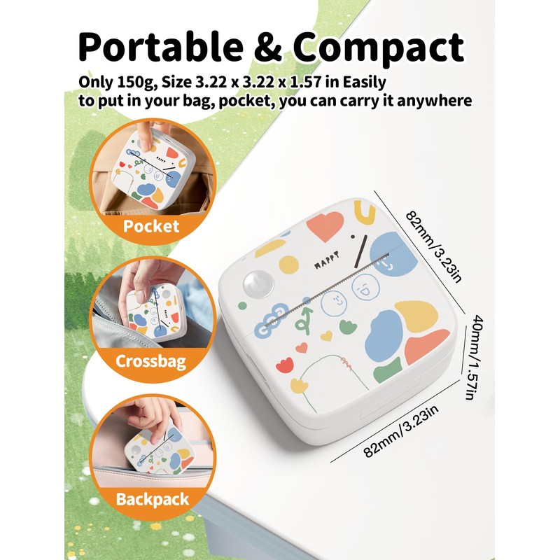 - Compact & Portable Sticker Printer: This mini sticker maker measures approximately 3.2 * 3.2 * 1.5 inches and weighs 5.3 ounces. It is small enough to fit in your pocket or backpack. Powerful branded APP feature provides you with enough customization options and supports co-creation at the same time. Perfect to buy as a gift for kids or students, it will inspire unlimited creativity.