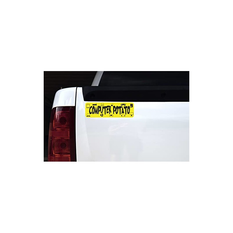 This magnet is 10 inches wide by 3 inches tall when applied. The words, COMPUTER POTATO, are printed on the magnet's yellow background in black letters. Black silhouettes of electronic devices and accessories decorate the magnet. This quality-made product is a side-splitting way to share your love of computers! However, it only attracts ferromagnetic metals.