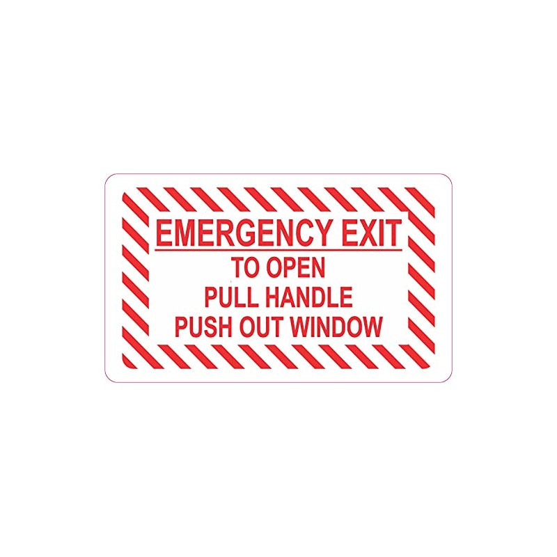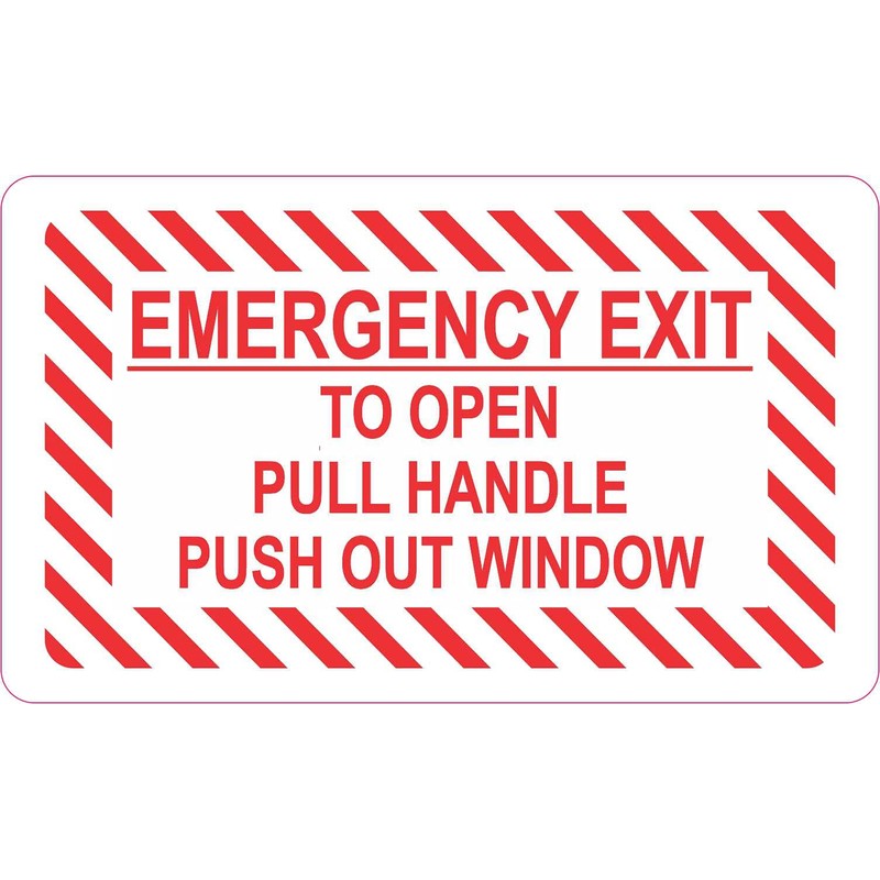 This sticker measures 5 inches wide by 3 inches tall. It has the words, EMERGENCY EXIT TO OPEN PULL HANDLE PUSH OUT WINDOW, printed in red letters on a white background. The sticker's border is accented by red, diagonal stripes. This carefully crafted product is durable and easily visible, making it a great way to promote safety!