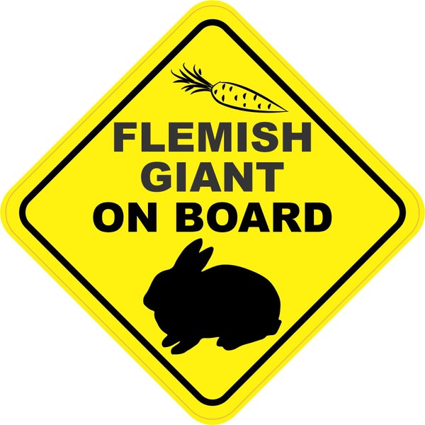 This diamond-shaped magnet is 6 inches wide by 6 inches tall when applied. It features the words, FLEMISH GIANT ON BOARD, in black letters on a yellow background. A sketch of a carrot is printed above the text, and a silhouette of a rabbit is printed below. A black border accents the edges of the magnet. This carefully crafted product is the perfect novelty for proud owners of Flemish giant rabbits! However, it only attracts ferromagnetic metals. All items shipped from the USA. All duties and taxes will be the responsibility of the buyer.