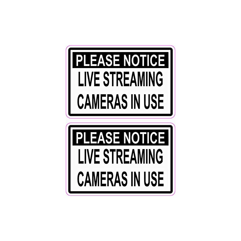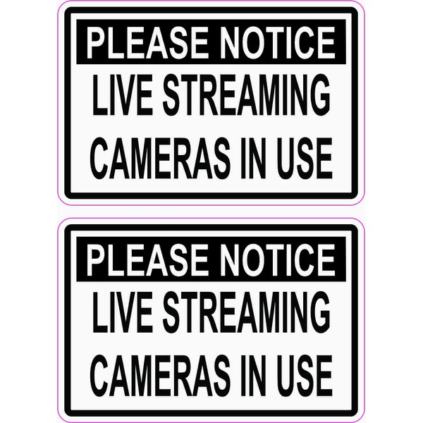 This package comes with two stickers. Each sticker is 3 inches wide by 2 inches tall when applied. The words, PLEASE NOTICE, are printed at the top of each sticker in white letters on a black rectangle. Under the rectangle, the words, LIVE STREAMING CAMERAS IN USE, are printed in black letters on a white background. A black border is printed just inside the edges of each sticker. The pink lines in the image shows where the stickers are cut; the pink lines are not printed on the sticker. These quality-made stickers are durable and easily visible, making it an effective way to maintain a secure environment!