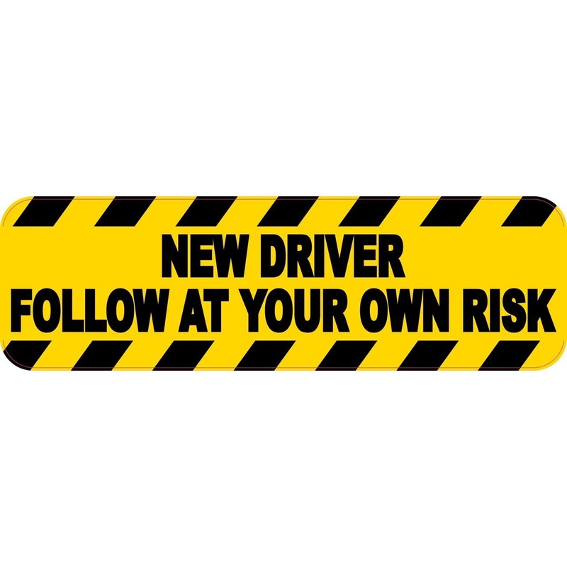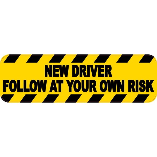 This bumper sticker is 10 inches wide by 3 inches tall when applied. It features the phrase, NEW DRIVER FOLLOW AT YOUR OWN RISK, in black letters on a yellow background. The top and bottom borders of the sticker are accented with yellow and black, diagonal stripes. Th is quality-made product is durable and easily visible, making it a useful tool for inexperienced motorists.