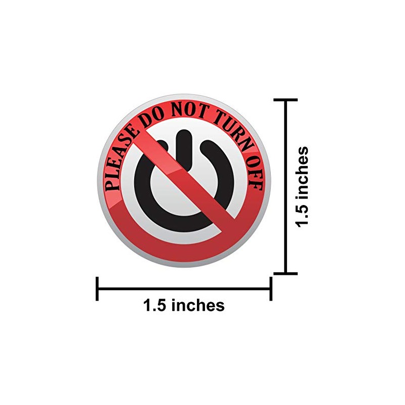 This product includes eight circular stickers, each sticker measuring approximately 1.5 inch wide by 1.5 inch tall when applied. Each sticker's design depicts a gray and black power symbol under a red circle and slash; the words, PLEASE DO NOT TURN OFF, are printed each sticker in black letters, contoured with the curve of the red circle. A thin, gray line forms a border around the sticker. These quality-made stickers are durable and easily visible, making them ideal for use in a variety of settings and scenarios!