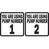 This product is a sheet of two stickers. Each sticker is 2.5 inches wide by 2.5 inches tall when applied. One sticker features the words, YOU ARE USING PUMP NUMBER 1, and the other sticker features the words, YOU ARE USING PUMP NUMBER 2. The text is printed in black on a white background. Both stickers have a black border around the edges. These carefully crafted stickers are durable and easily visible, making them a great way to keep your pumps clearly labeled!