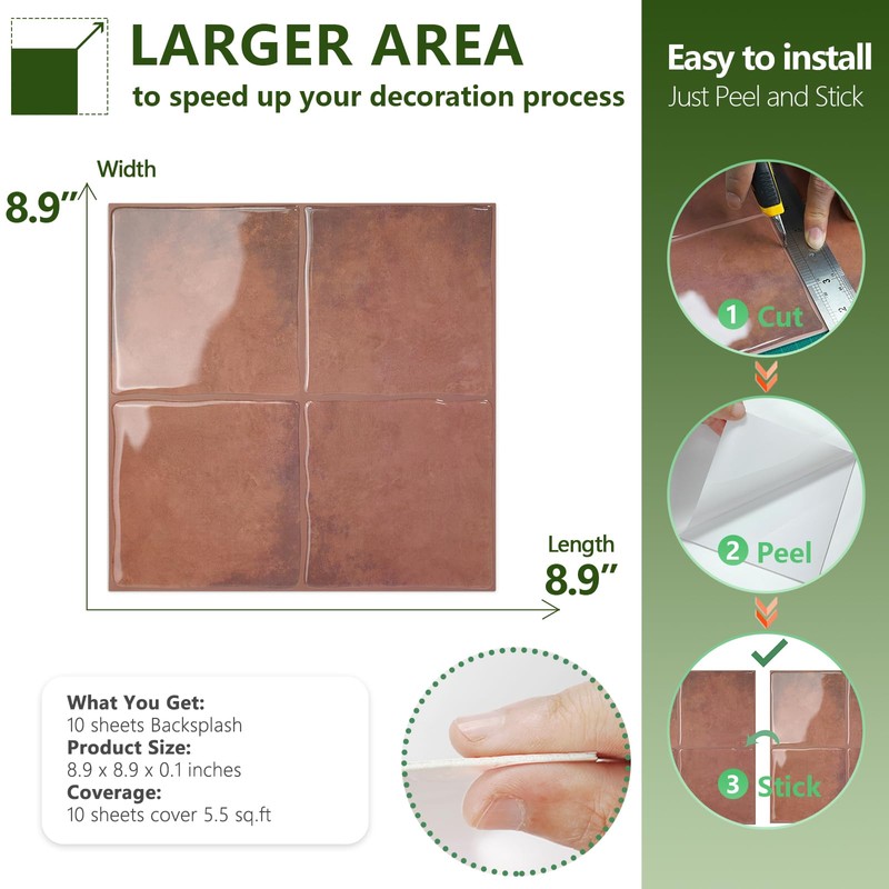 STICKGOO 10 Sheets Peel and Stick Backsplash - 9" x 9" 3D Adhesive Peel and Stick Tile Backsplash for Kitchen&Bathroom