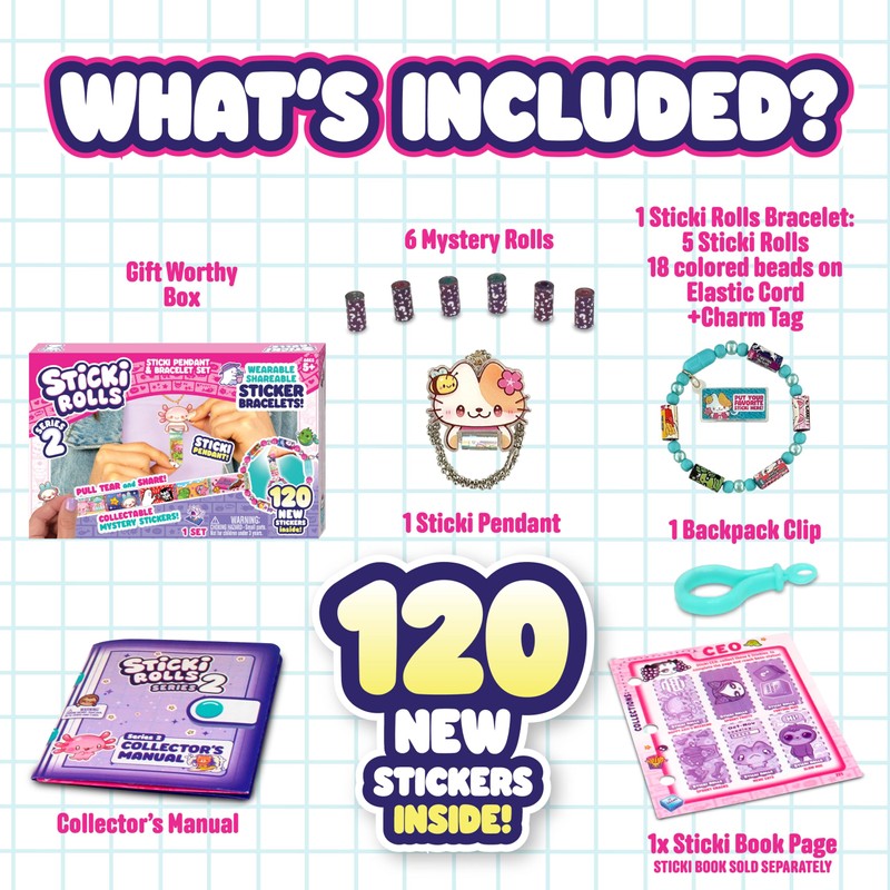 - ๐ ๐๐๐ฆ๐ฌ ๐ง๐ข ๐จ๐ฆ๐: Sticki Rolls stickers are restickable and mess-free! The Pendant Pack comes with an assembled bracelet and custom character charm tag, making setup simple and fun for kids ages 5 and up.