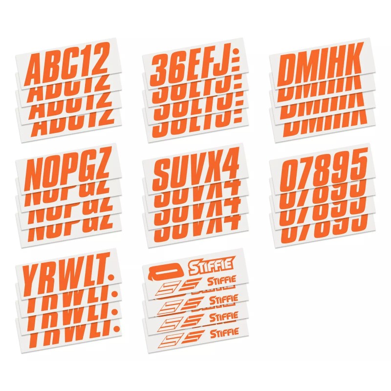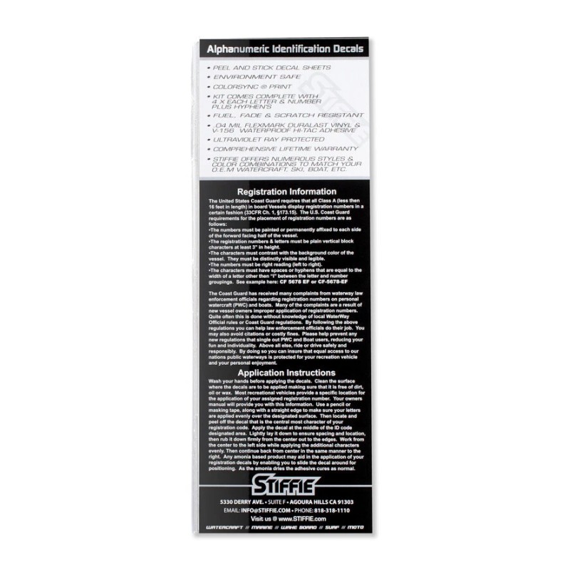 All Alphanumeric ID Kits offered by STIFFIE come with characters that are 3" in height and meet or exceed US Coast Guard Regulations. Every ID kit comes with 4 sets of 0-9 and A-Z decals (146 total decals). Stiffie Alphanumeric registration decals are resistant to chemical deterioration, fading, curling, tearing and scratching. Stiffie decals are also UV Coated for protection from harmful ultra-violet (UV) rays.