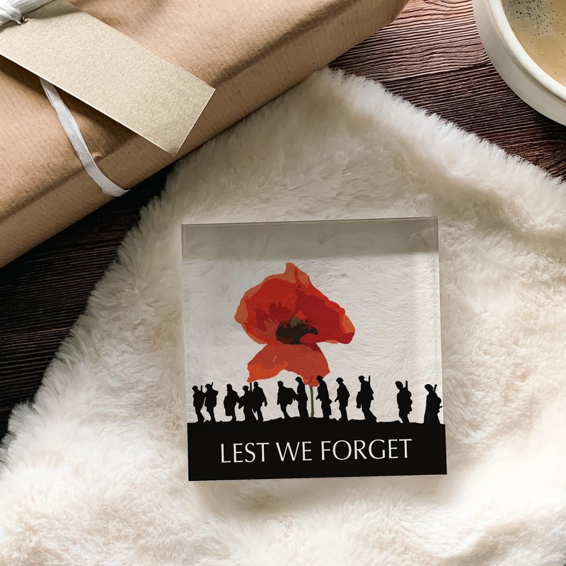 - Commemorative "Lest We Forget" Poppy Acrylic Block, measuring 100mm x 100mm and 20mm thick, serves as a timeless tribute to honor war heroes and soldiers.