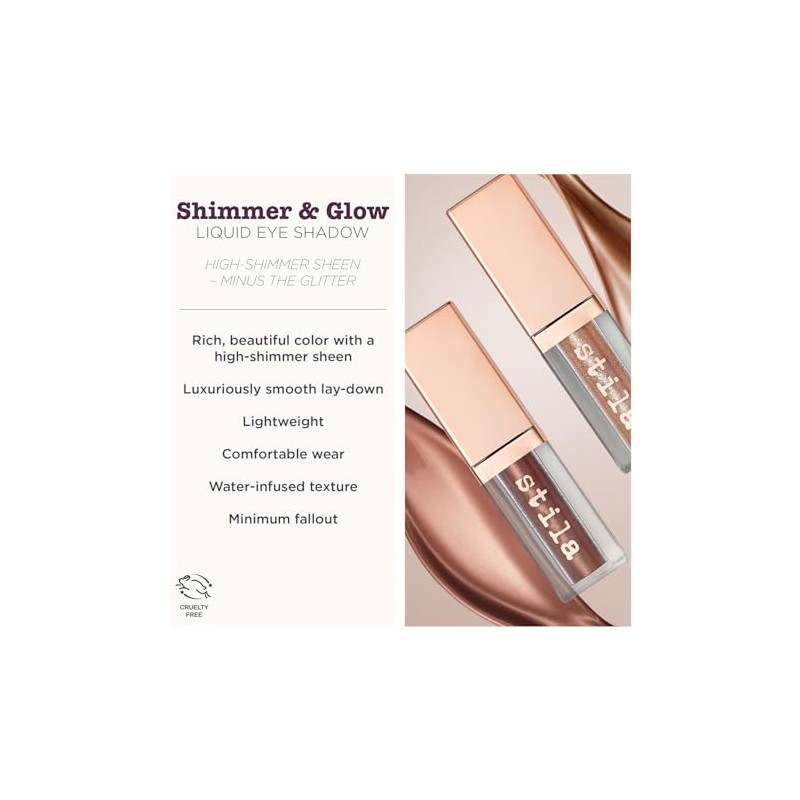 Product DescriptionGlisten and gleam with Stila's NEW Shimmer & Glow Liquid Eye Shadow C rich, beautiful color with a high shimmer sheen, minus the glitter! The pearl-packed translucent base offers versatile wear. Apply a sheer layer for day or an added layer for nighttime drama. A truly unique formula - over 40% water gives a barely-there, refreshing feel and smooth color laydown. The non-tacky, non-transfer, adhesive base means minimal fallout - no primer needed! 8 shimmering shades inspired by our most iconic powder eye shadow colors.Brand StoryAt the heart of Stila, we believe that the right makeup can turn even the simplest look into a statement as authentic as your signature.