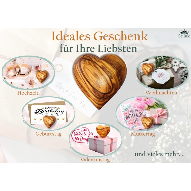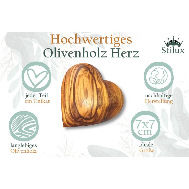 - Stylish natural product: 100% natural product handmade from untreated olive wood, refined with olive oil, without varnish and free from harmful substances. Thanks to the unique wood grain with irregular fibre gradient on a smooth surface, each wooden heart is unique and offers an extraordinary look. A beautiful unique piece with incomparable character.