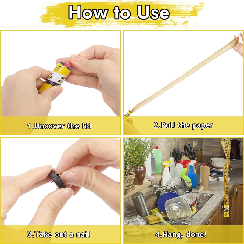 - Fly strips: hang the sticky fly strips outdoor and indoor where there are many flies, the sticky glue will stick them and keep the fly from escaping. The higher the temperature, the effect of fly tape is better.