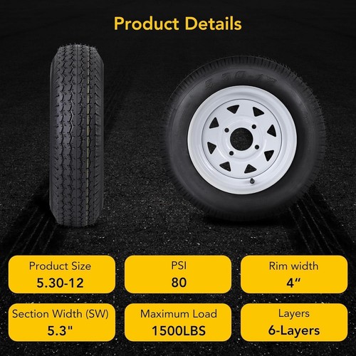 STMHOM Set of 2 Trailer Tires with 12" Rim 4 Lug on 4" Load Range C 6PR 5.30-12 5.30x12