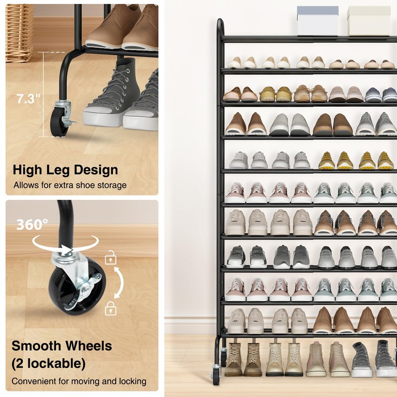 - Practical Arched Handles and Smooth-Rolling Wheels: This closet shoe rack features sturdy arched handles and smooth-rolling wheels for easy mobility, allowing you to position it wherever you like. With the added convenience of brakes on the wheels, you can securely lock the shoe rack in place when needed