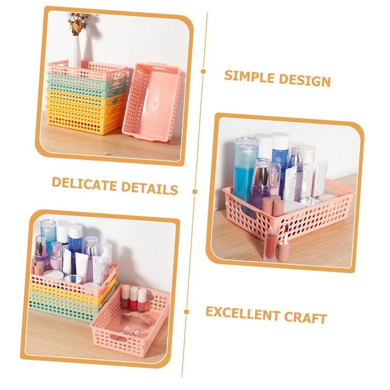 - Desk basket: these plastic storage baskets are storing cosmetics, fruits, vegetables, office supplies, tools, small parts.