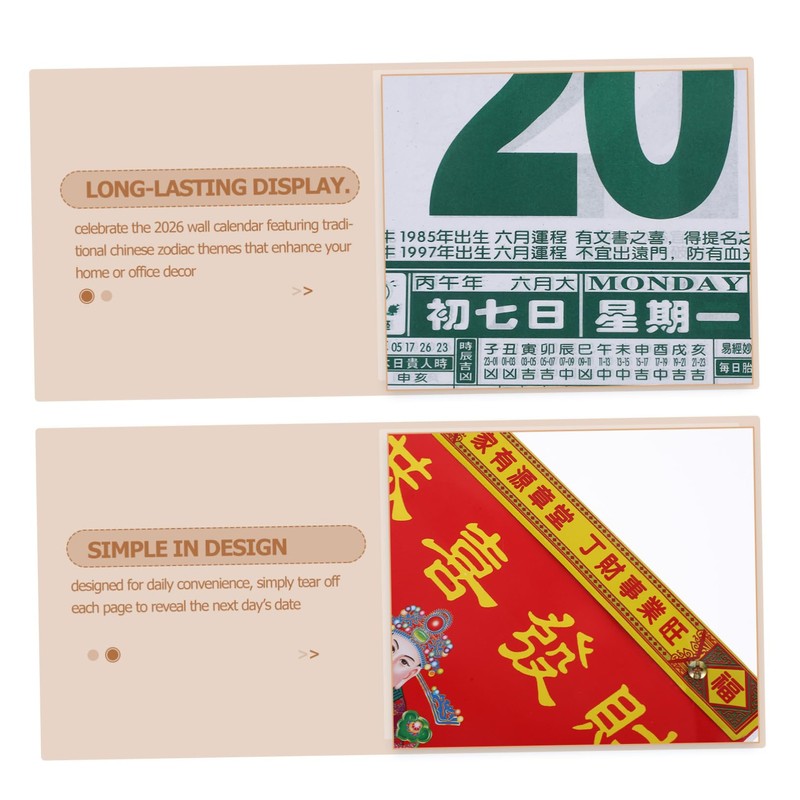 Each page of this daily wall calendar is designed for easy tear-off, allowing you to effortlessly check daily dates, zodiac signs, and important occasions.Perfect for daily planning, this calendar combines functionality with cultural appreciation, making it an essential tool for organizing your schedule.In addition to the traditional calendar, it includes valuable information such as solar terms, holidays, and auspicious dates, catering to all your daily needs.