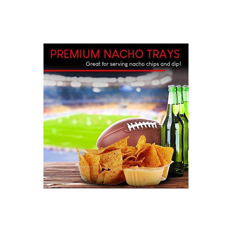 • Great Value Pack: Comes with 100 nacho trays. The large compartment holds 19.1oz, and the small compartment holds 3.3oz - a total capacity of 22.4oz. Measures 8 Length x 6 Width x 1.5 Height.
