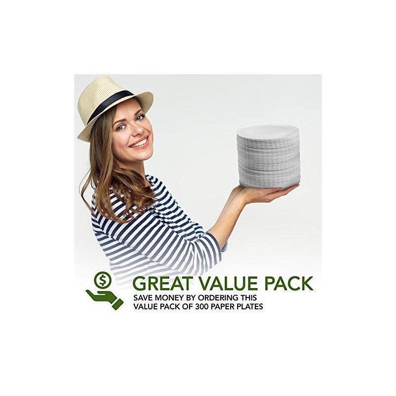 - GREAT VALUE PACK: Save money by ordering this value pack of 300 paper plates. Each plate has a 9. 0" diameter, large enough for serving guests for catered events.
