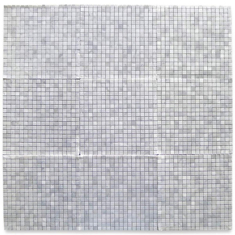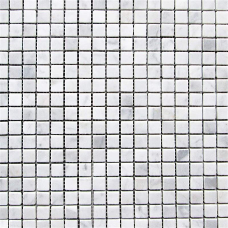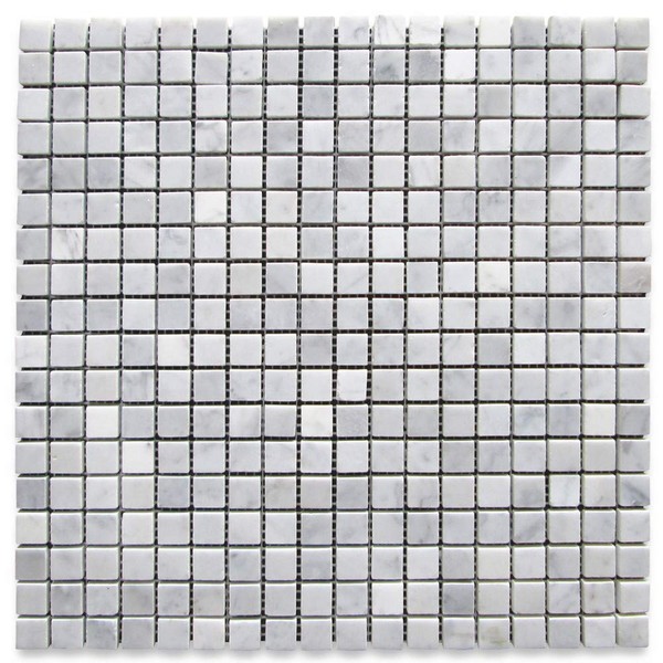 - Carrara White Marble 5/8"x5/8" square pieces mounted on 12"x12" sturdy mesh tile sheet