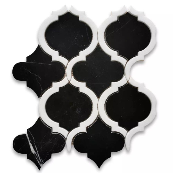 Premium Grade Nero Marquina Marble Waterjet Arabesque Baroque Grand Lantern Mosaic Tiles w/ Thassos White Outline. Black Marquina Marble Polished Waterjet Arabesque Baroque Grand Lantern Mosaic Wall & Floor Tiles are perfect for any interior projects. The Nero Marquina Venato Marble Waterjet Arabesque Lantern Mosaic tiles can be used for a kitchen backsplash, bathroom flooring, shower surround, dining room, entryway, spa. Our timeless Glossy Nero Marquinia Black Marble Waterjet Baroque Lantern Mosaic tiles with a large selection of coordinating products is available and include arabesque, fish scale, penny round, herringbone, basketweave mosaics, 12x12, 18x18, 12x34, subway tiles, moldings, borders, and more.