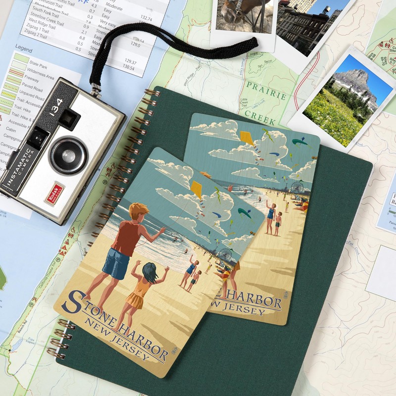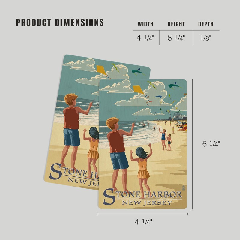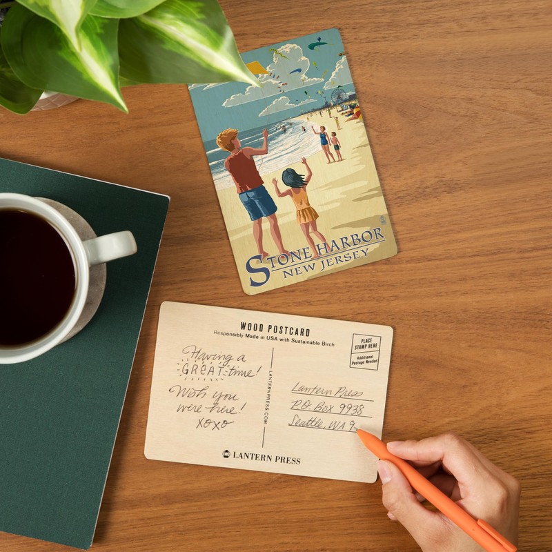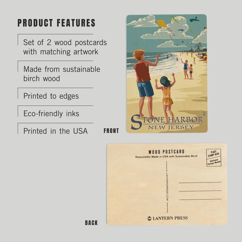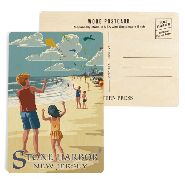 Original Lantern Press artwork printed on high-quality birch wood postcards, boasts sharp detail and vivid imagery of Stone Harbor, New Jersey, Kite Flyers (4x6 Birch Wood Postcards, 2-Pack Stationary, Rustic Home Wall Decor).