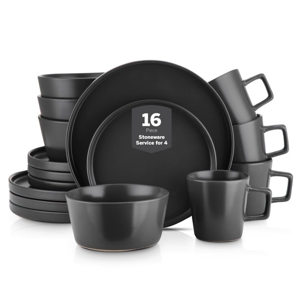 - 16 Piece dinnerware set - stoneware is hip, cool and trendy. Especially in a fashionable Black Matte. These sets of dishes make a statement.