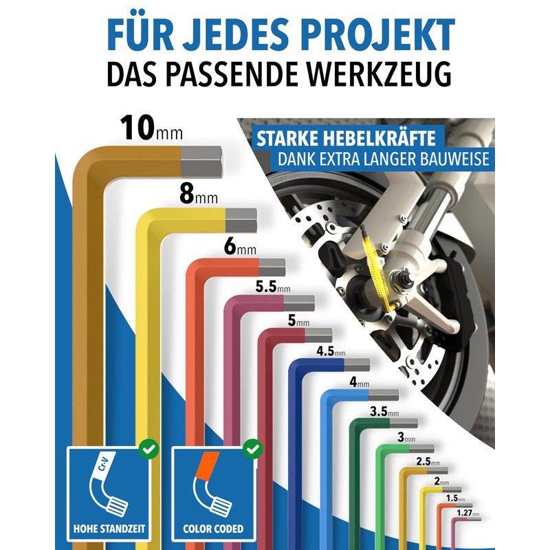 - Easy identification: in this set, each Allen key is designed in a different colour, this allows clear and quick identification and facilitates the workflow