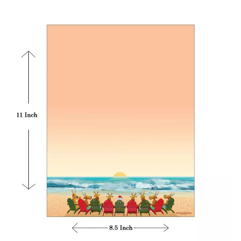 There is no better way to express the creative idea that comes to mind with this fun holiday stationery for letters, invitations, etc. It features a beautiful view of the ocean, where Santa and his reindeer are enjoying the perfect sunset on the comfortable Adirondack chairs! You can write a personalized message on the smooth blank background or get something special printed on it. Avail this 8.5 x 11 inches Stationery Letterhead in a pack of 60 sheets per pack.