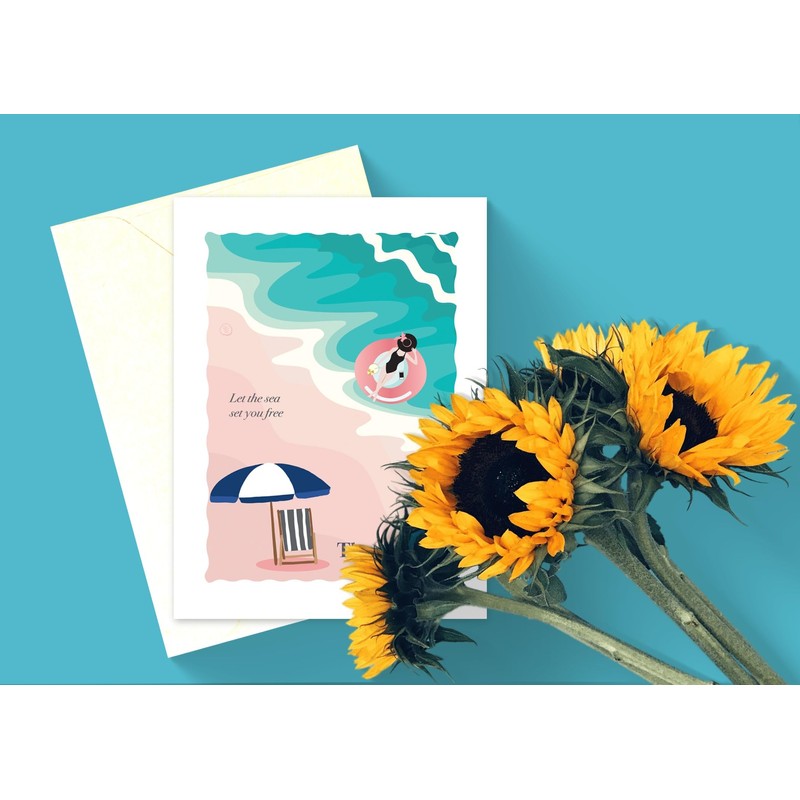 - Send gratitude with a splash of serenity. This "Let the Sea Set You Free" Beach Thank You Note Card Set features a peaceful pastel beach scene with a woman floating in an inner tube, dressed in a classic black bathing suit, gently drifting near a beach umbrella along a calm shoreline. A perfect blend of relaxation and appreciation, each card is designed to bring the carefree spirit of the coast to every message.