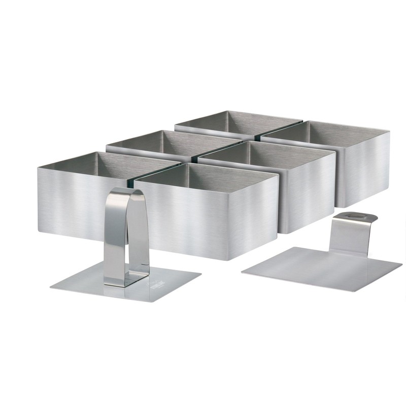 - Package Includes:6 x Square Shapes, Approx. 8 x 8 cm. Height: approx. 5 cm, 1 x lifter: 8.5 x 8.5 cm, 1 x stamp: approx. 7.7 x 7.7 cm; Material: stainless steel. Can also be used as small cake rings or burger moulds.