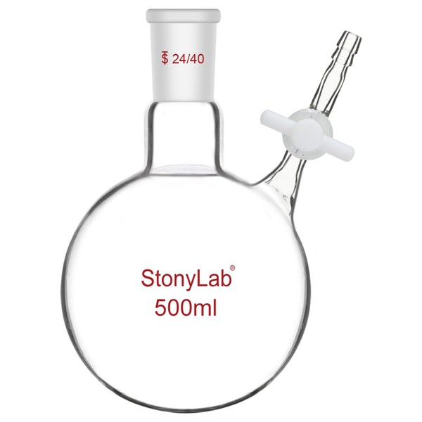 Stonylab Reaction Flask - Borosilicate Glass Single-Neck Flask with 24/40 Joint and PTFE Stopcock Valve, Round Bottom, 500 ml