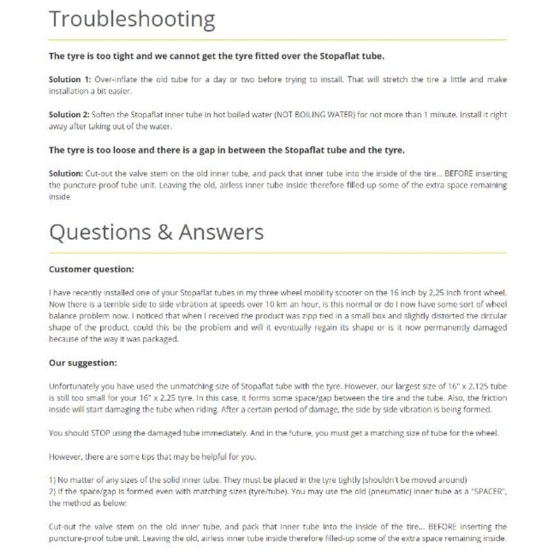 STOP-A-FLAT offers a range of non-pneumatic inner tubes which are impossible to puncture. A simple one-off and low-cost solution. Ideal for children's bicycles, buggies, pushchairs and cycle trailers. The latest high-tech solution providing hard-wearing, long-lasting and sustainability. It is inserted in the same way as a normal inner tube using your existing tread. Stop A Flat tubes are manufactured from a polymer of Ethylene Vinyl Acetate, (EVA), using a closed cell construction to prevent the absorption of moisture and water.