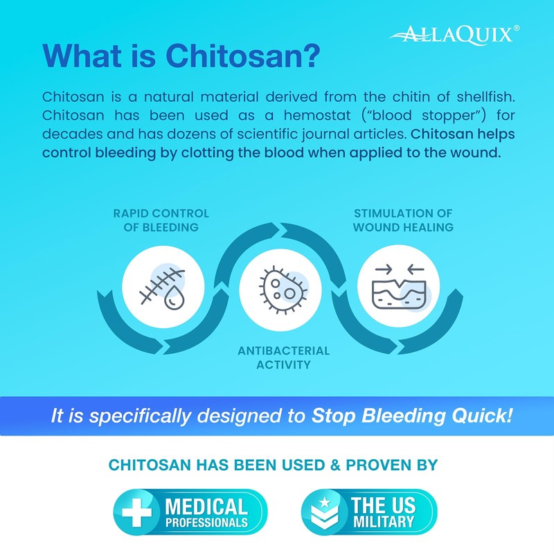 WHAT IS CHITOSAN? Chitosan has been used by the U.S. Military in combat to stop bleeding fast. AllaQuix is designed to work for all people who have trouble stopping bleeding, even people with bleeding and clotting disorders, and people on blood thinners!