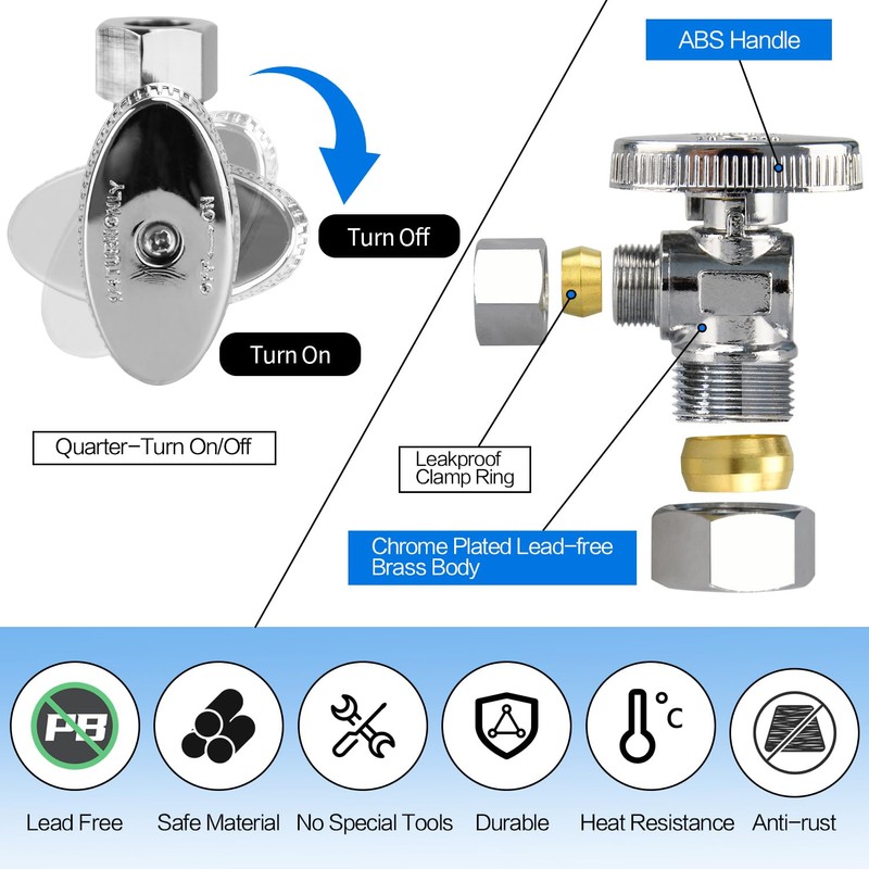 • 【Perfect for Use】- Angle stop valve is designed to control and shut off water flow to fixtures or appliances for maintenance and repair. It is perfect for working in tight spaces. You don't need to turn off the entire household water supply when maintenance is required.