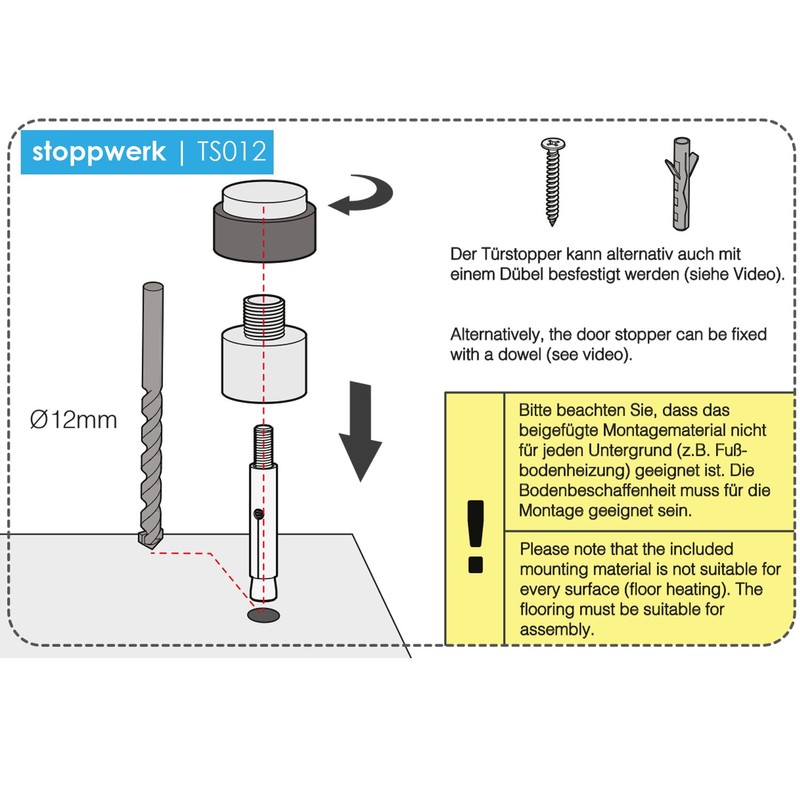 - Easy assembly - Thanks to the fully supplied assembly accessories (fixing screws + dowels) as well as the easy-to-understand assembly and video instructions, the door stop can be easily attached. A drill hole is required for floor mounting.