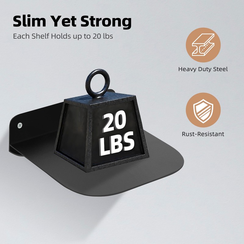 - 【Durable & Secure】: Made of heavy-duty stainless steel with rust-resistant coating, each wall-mounted bookshelf holds up to 20 lbs of books or decor without bending. The 2°upward tilt design keeps your books in place and prevents slipping. Dimensions: 4.5"D x 5"W x 1.5"H.