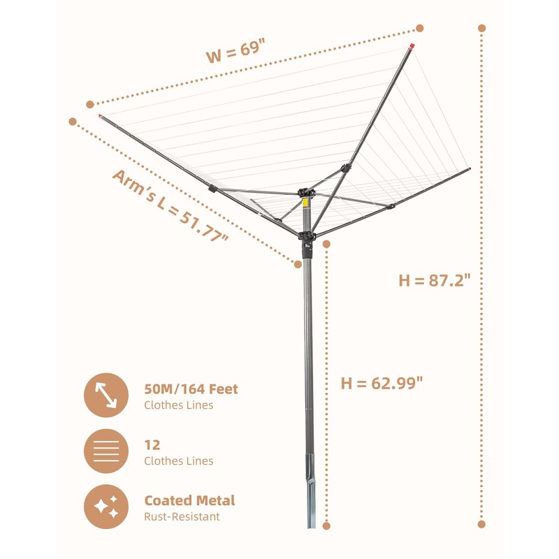 - HEAVY DUTY STRUCTURE - The total unfolded size of this umbrella drying rack is 97"D x 69"W x 92.5"H, and generous 164 ft drying washing line - this outdoor clothes line has enough space to accommodate bedding and other washing items