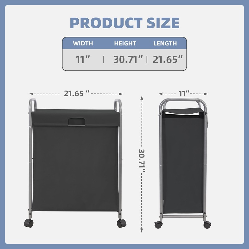 - Large Capacity: The laundry sorter has a frame dimension of 21.65" L x 11" W x 30.7" H. It provides a total capacity of 85 L, which is about 2 loads. Equipped with a cover to prevent dust and protect privacy.