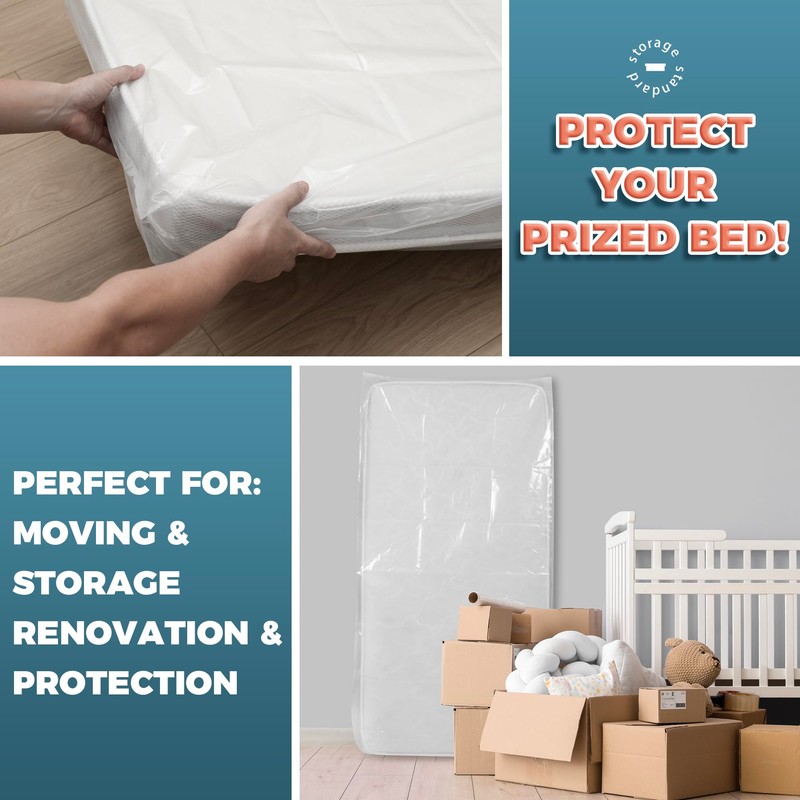 Secure & Durable Mattress Protection Keep your crib mattress safe with the Crib Mattress Storage Bag from Storage Standard. Made from heavy-duty 4-mil thick plastic, this mattress mover bag is designed to securely fit standard crib mattresses, providing reliable protection during moving, storage, or renovation projects. The clear plastic material allows for easy identification of your mattress, making it simple to organize and retrieve when needed. Waterproof & Reusable Design This mattress protector for storage is both waterproof and reusable, offering long-lasting protection against dust, moisture, and potential damage. The bag comes equipped with 3 pre-cut tape strips and a label sticker, ensuring a secure closure that keeps your mattress clean and dry, whether it's in storage or being transported. Ideal for Moving & Storage Ideal for homeowners, moving companies, and contractors alike, this crib mattress storage bag is an essential tool for anyone needing bed bags for moving. Its durable construction and secure closure system provide peace of mind, knowing that your crib mattress is protected throughout any move or during long-term storage. Trust Storage Standard for dependable protection of your valuable items.