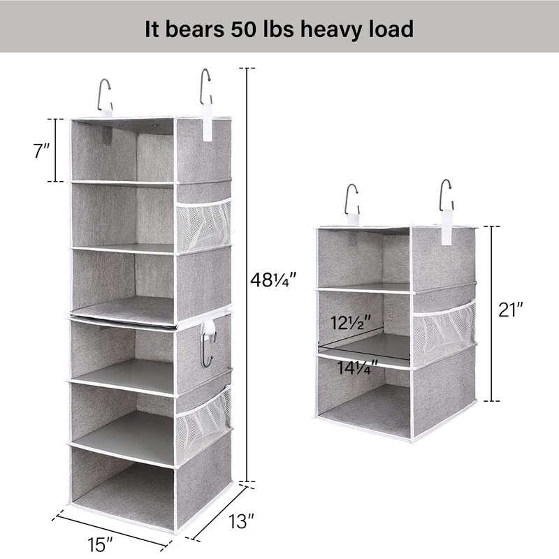 - Interchangeable between the 6-shelf hanging closet and two separate 3-shelf hanging organizers through two strong zippers.