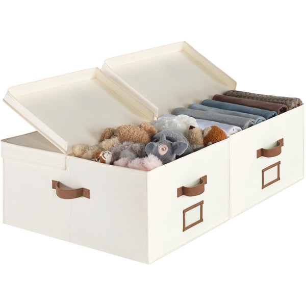 StorageWorks Extra Large Clothes Storage Bins, 55L Fabric Storage Baskets with Double-Open Lid and Divider Board, Storage Bins for Clothes, Linen Closet Organizers with Handles, Ivory White, 2-Pack